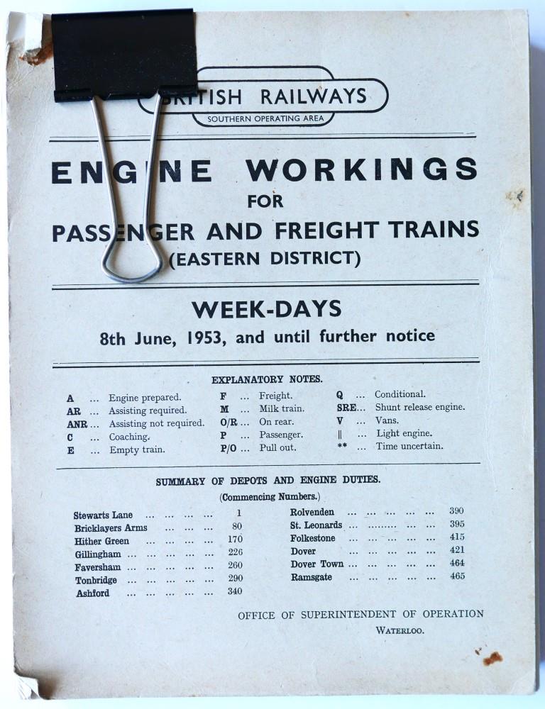 | 102 | BR(S) Eastern District booklet ‘Engine Workings for Passenger and Freight Trains – Weekdays’. Card covers, 278pp held by bulldog clip, dated June 1953. | £5 |  |