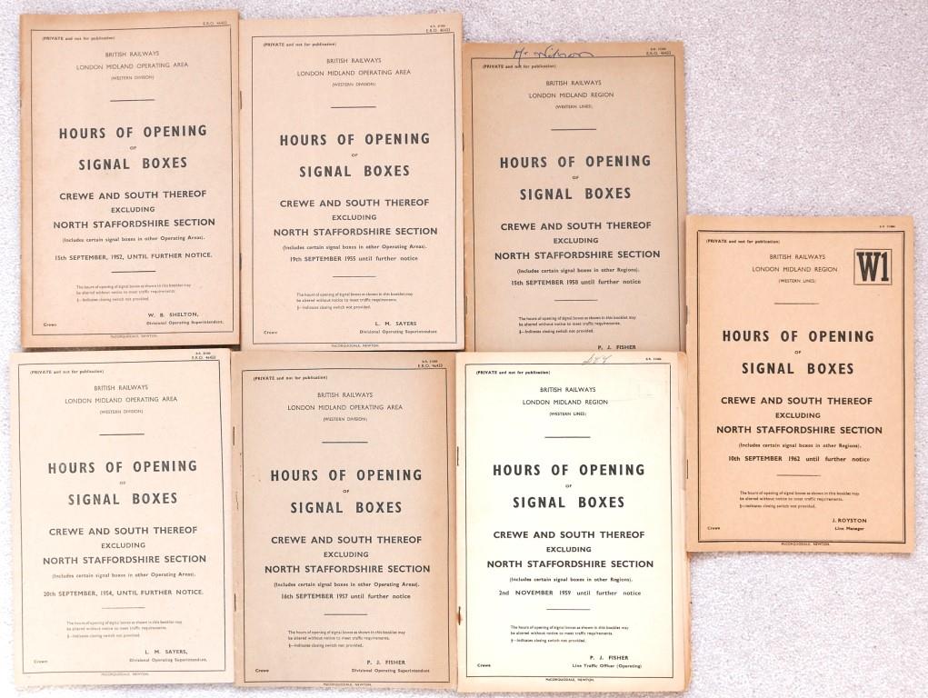 | 104 | Seven BR(M) Western Division booklets ‘Hours of Duty at Signal Boxes – Crewe and South thereof excluding North Staffordshire Section’. Each 20+pp dated September 1952, September 1954, September 1955, September 1957, September 1958, November 1959, September 1962. | £110 |  |