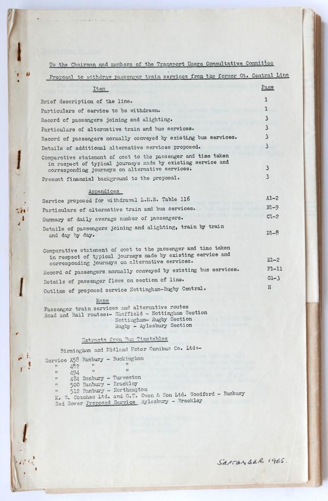 | 106 | Submission from BR to the Transport Users Consultative Commission re the withdrawal of passenger services on the ex GC main line. Foolscap sized, 5 typescript pages plus several charts and tables. Dated September 1965. | £75 |  |