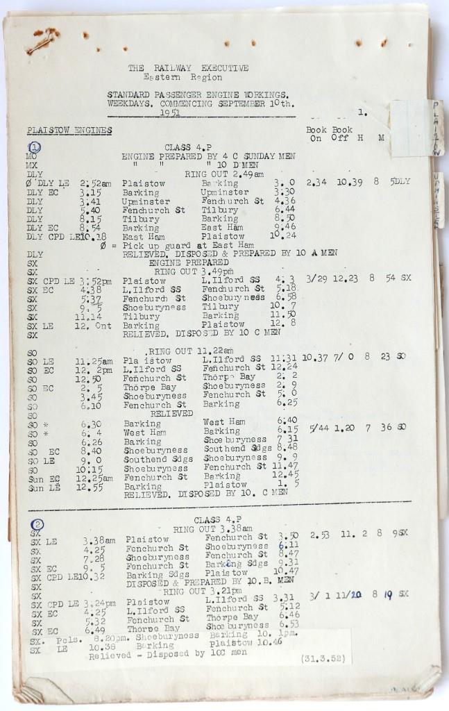 | 107 | BR(E) LT&S Section passenger engine workings weekdays, dated September 1951. Foolscap sized, 33 typescript pages covering Plaistow, Upminster, Tilbury, etc. | £160 |  |
