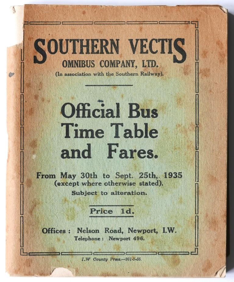 | 116 | Southern Vectis time and faretable booklet. Green paperback covers, 141pp dated May 1935. Covers very faded and detached at split spine. | £85 |  |