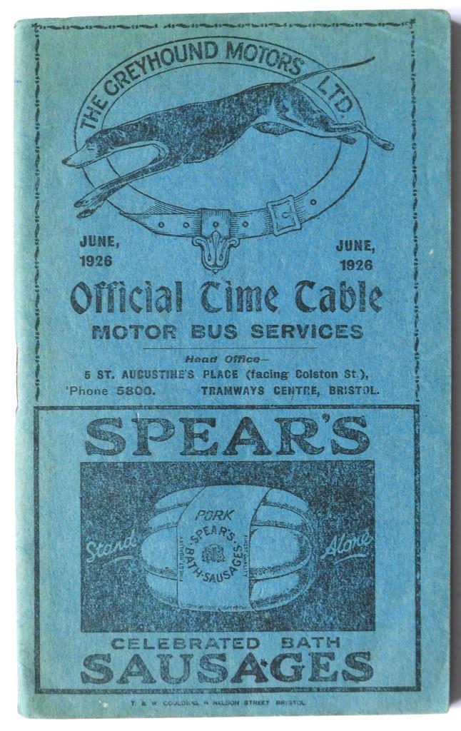| 117 | Greyhound Motors (Bristol) timetable booklet. Blue paperback covers showing company logo, 48pp dated June 1926. | £80 |  |