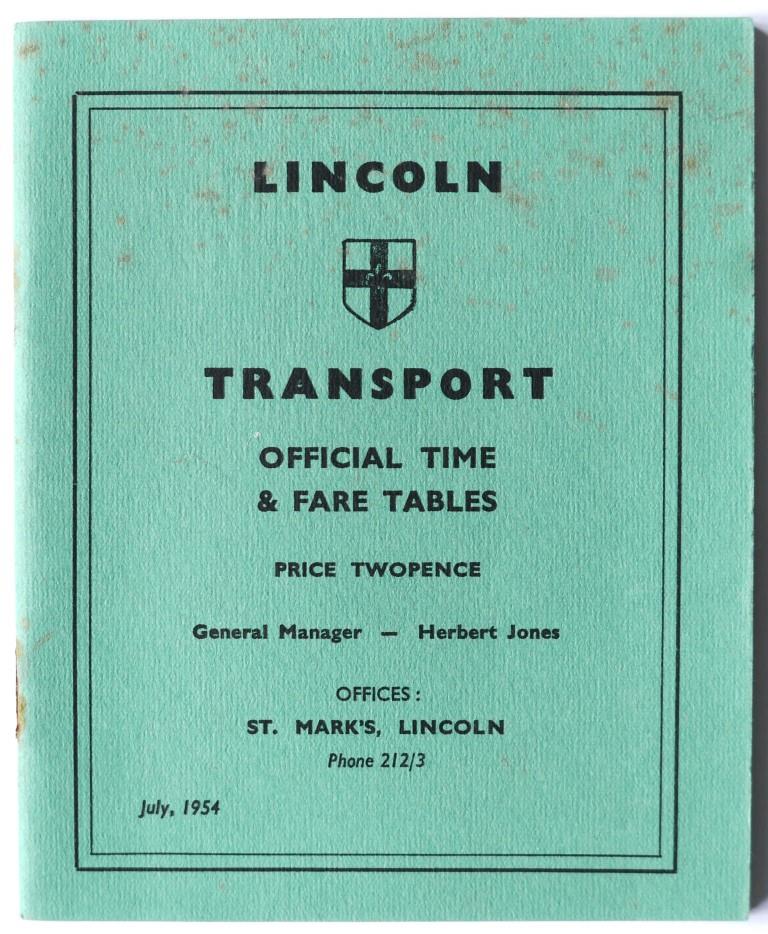 | 123 | Lincoln Transport time and faretable booklet dated July 1954. Green covers, 31pp. | £12 |  |