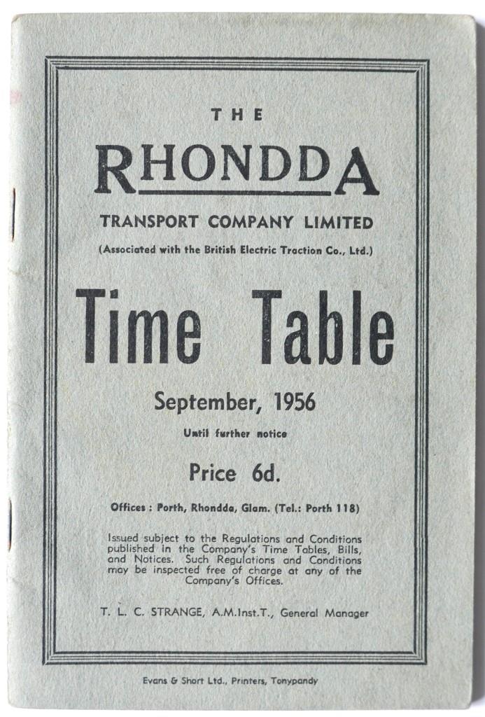 | 125 | Rhondda Transport Company timetable booklet dated September 1956. Grey coloured covers, 76pp with centre page map. | £55 |  |