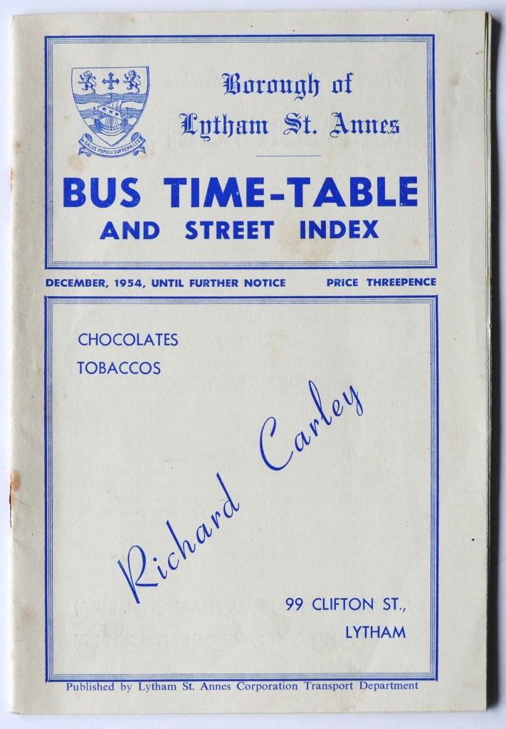 | 128 | Borough of Lytham St.Annes bus timetable and street index. Paperback, 28pp dated December 1954. | £9 |  |