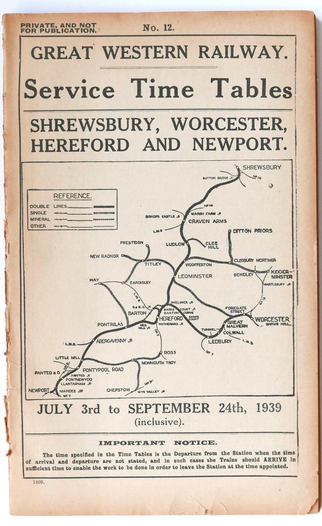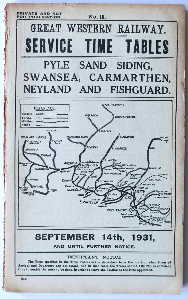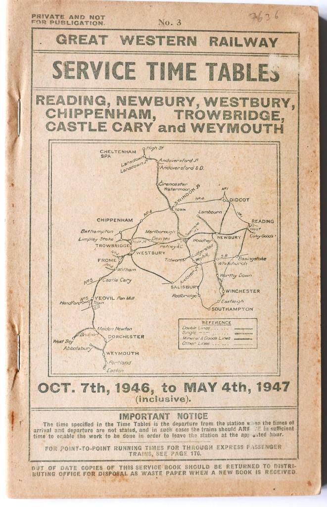 | 83 | BR(W) No.7 section service timetable covering Swindon, Gloucester, Cardiff and Pyle. 361pp, dated June 1953. Disbound, front page detached. | £11 |  |