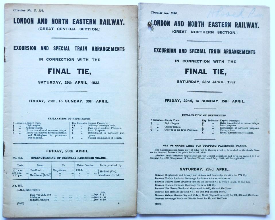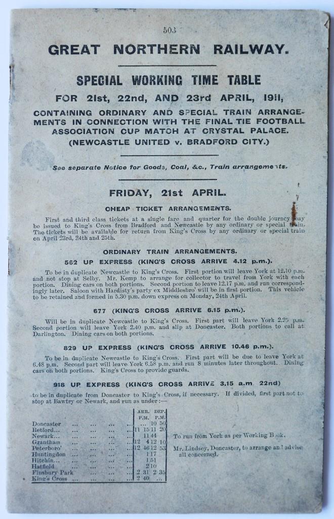 | 639 | GNR special working timetable in connection with the FA Cup final at Crystal Palace between Newcastle and Bradford City, April 1911. 32pp, covers worn/grubby, contents OK. | £8 |  |