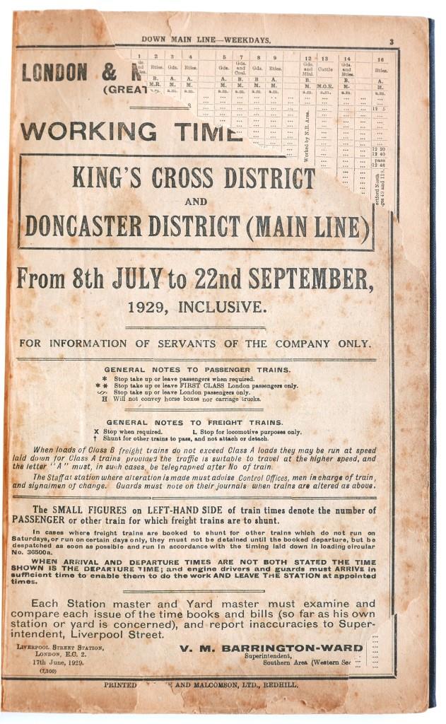 | 703 | SR Central Division working timetable of passenger and goods trains. 111pp dated March 1929. Tear and loss to front cover. | £55 |  |