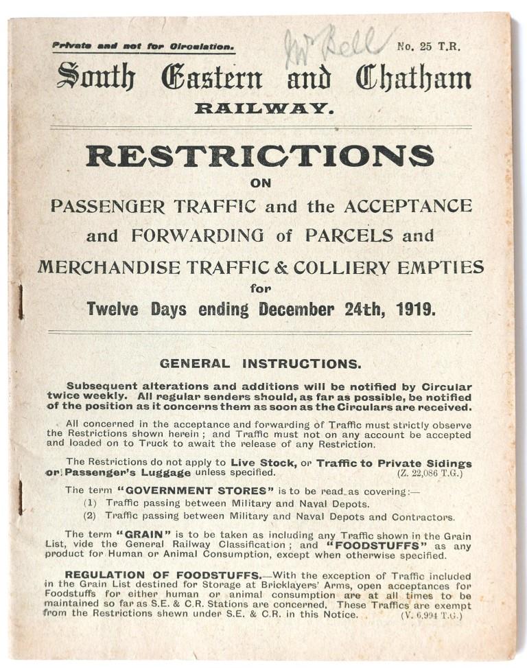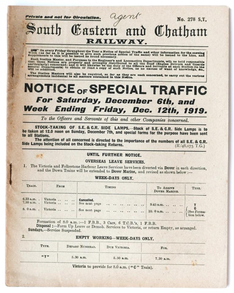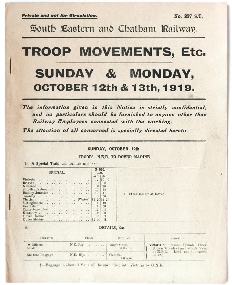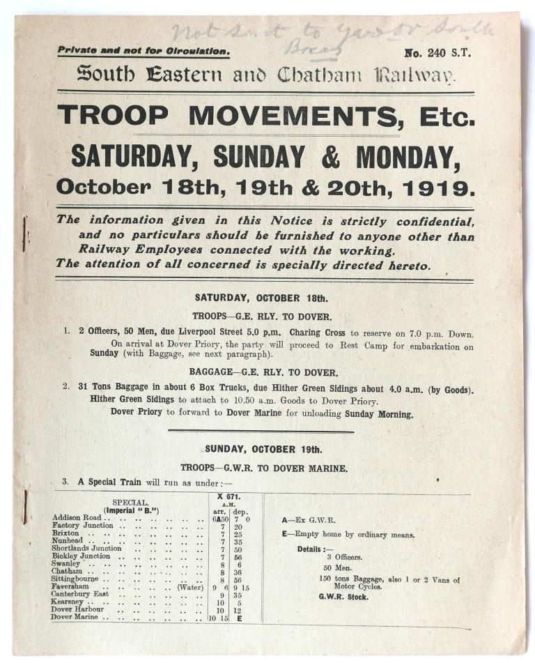 | 637 | SECR special traffic notice No.240 re troop movements. 7pp dated 18th October 1919. | £36 |  |