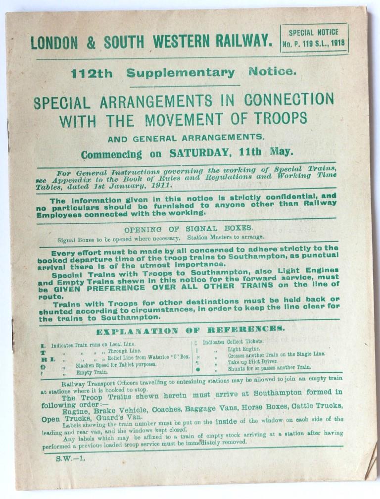 | 633 | LSWR 112th supplementary notice No.119 re special arrangements in connection with the movement of troops, etc. Green print, 23pp dated 11th May 1918. | £6 |  |