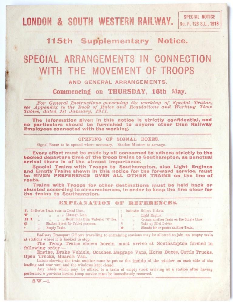 | 634 | LSWR 115th supplementary notice No.123 re special arrangements in connection with the movement of troops, etc. Red print, 7pp dated 16th May 1918. | £32 |  |