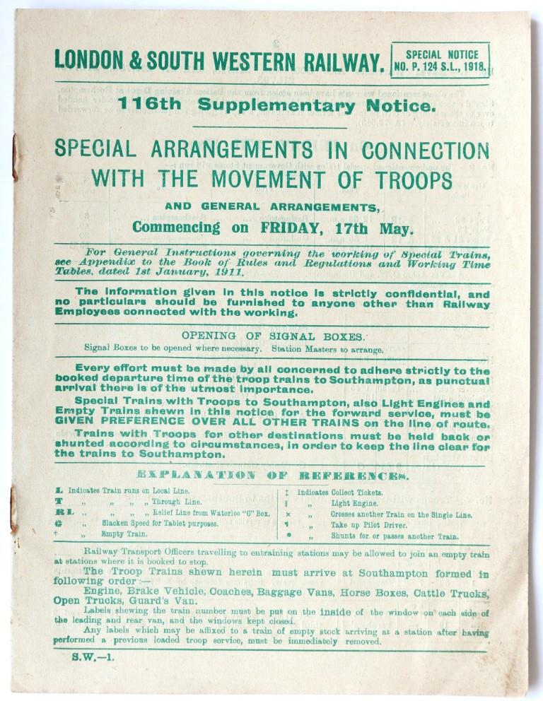 | 635 | LSWR 116th supplementary notice No.124 re special arrangements in connection with the movement of troops, etc. Green print, 13pp dated 17th May 1918. | £6 |  |