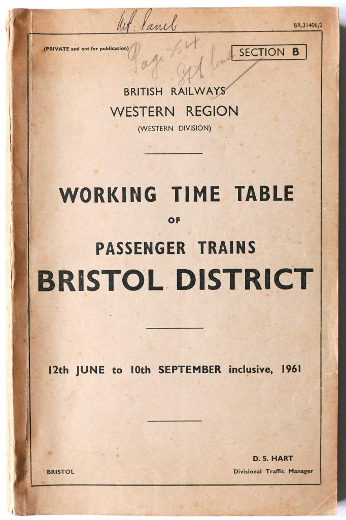 | 64 | BR(W) Western Division section B working timetable of passenger trains Bristol District. 281pp dated June 1961. | £22 |  |