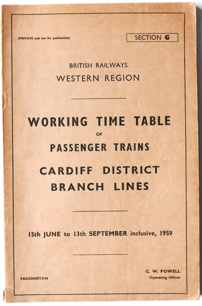 | 65 | BR(W) section G working timetable of passenger trains Cardiff District branch lines. 127pp dated June 1959. | £8 |  |