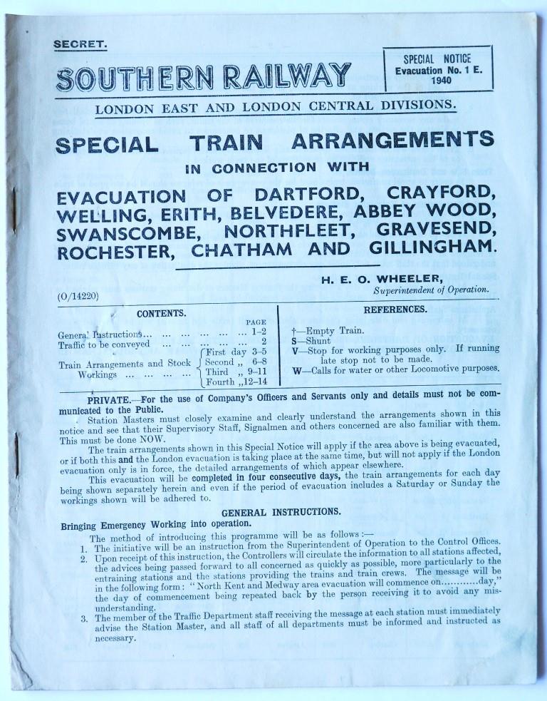 | 697 | SR London East and London Central Divisions Evacuation Notice No. 1E 1940 ’Special Train Arrangements in Connection with Evacuation of Dartford, Crayford, Welling, Erith, Belvedere, Abbey Wood, Swanscombe, Northfleet, Gravesend, Rochester, Chatham and Gillingham’. 14pp, dated 1940. | £42 |  |