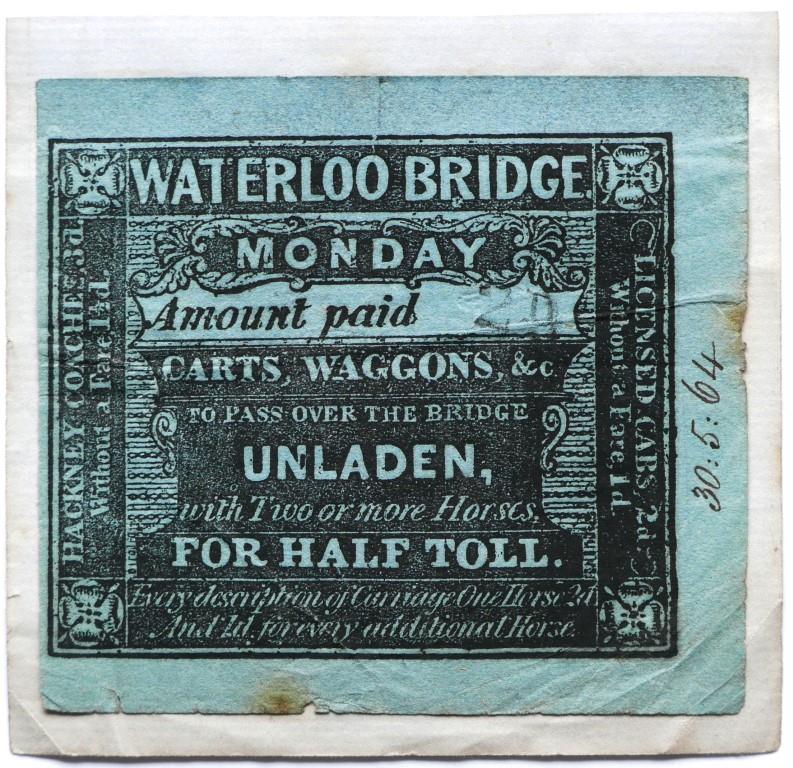 | 713 | Paper type toll ticket for carts and wagons to pass over Waterloo Bridge. Dated 1864. Attached to card along top edge. | £19 |  |