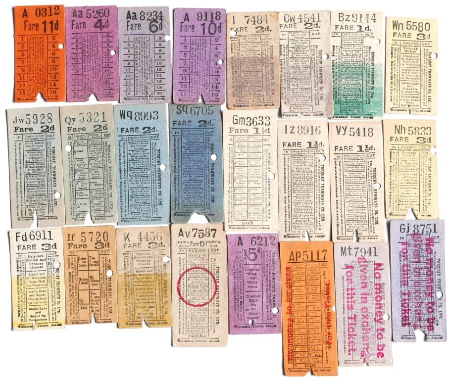 | 723 | 24 Torquay Tramways Company geographical and numerical punch type tickets. Values up to 11d. Some duplication. | £36 |  |