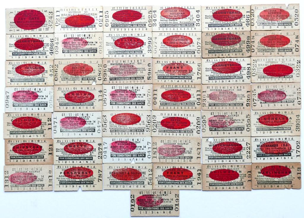 | 767 | Approx 42 SR red blob Edmondson card platform tickets. Occasional duplication and back damage to approx six. Plus LBSCR platform ticket from Fay Gate. | £32 |  |