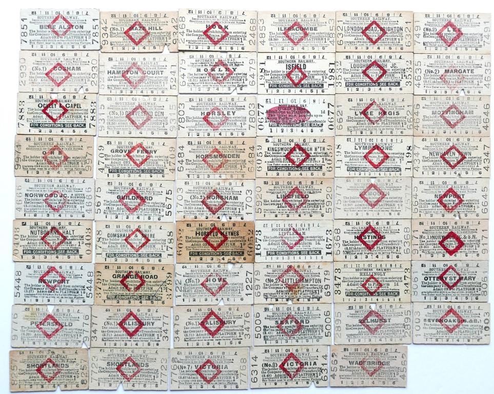 | 770 | Approx 52 SR red diamond Edmondson card platform tickets. Tape marks on the back of approx half. Occasional duplication. | £90 |  |