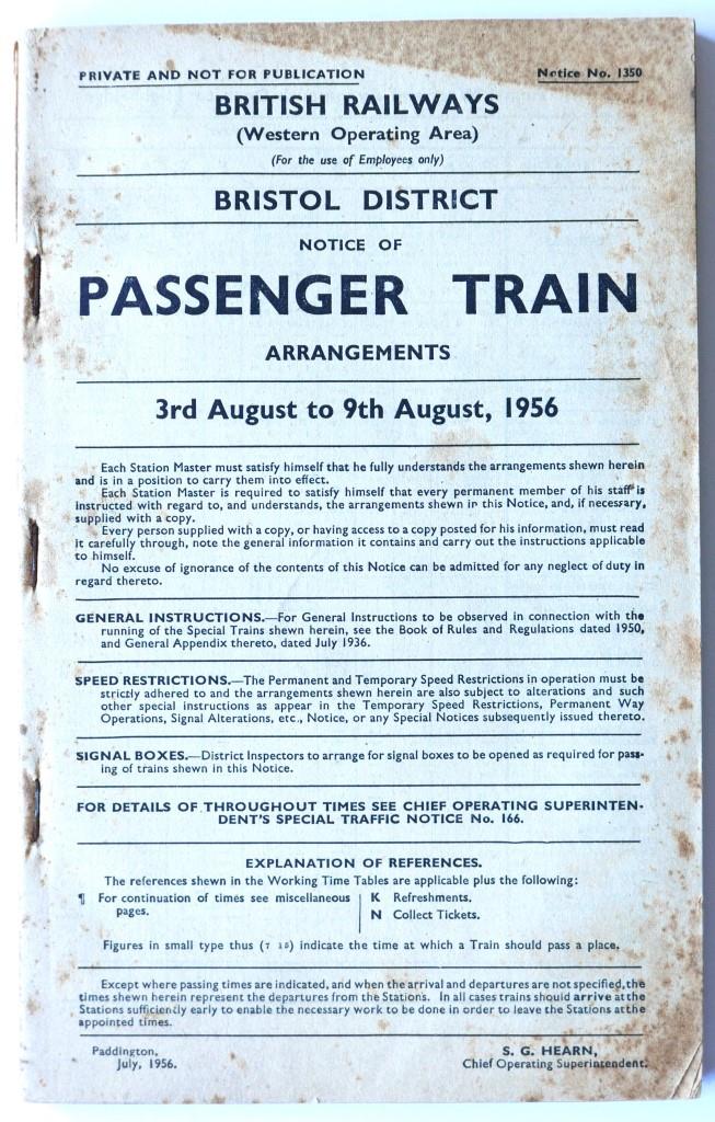 | 82 | BR(W) Western Division Bristol District Notice No.1350 ’Notice of Passenger Train Arrangements’. 173pp dated 3rd August 1956. | £11 |  |