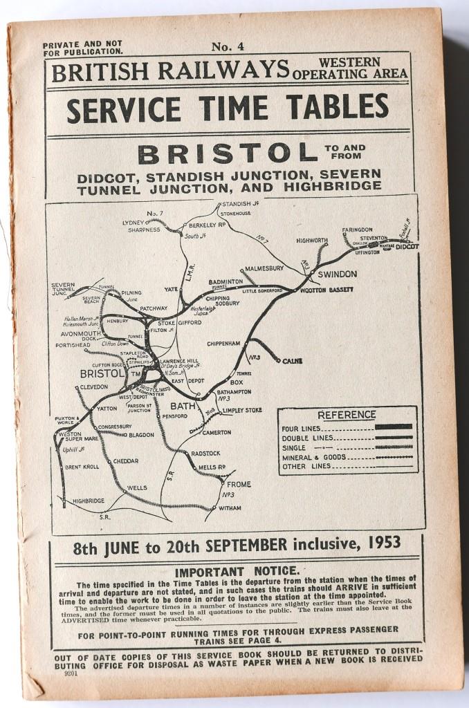 | 84 | BR(W) No.4 section service timetable – Bristol to and from Didcot, Standish Junction, Severn Tunnel Junction and Highbridge. 372pp, dated June 1953. Disbound. | £18 |  |