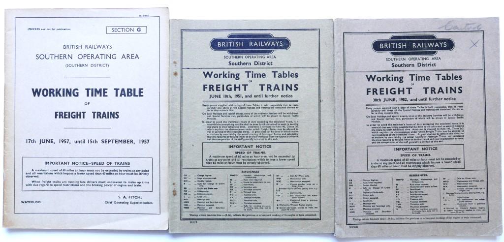 | 95 | BR(S) Southern District working timetable of freight trains. 80pp dated June 1951. Plus similar dated June 1952 and June 1957. | £42 |  |