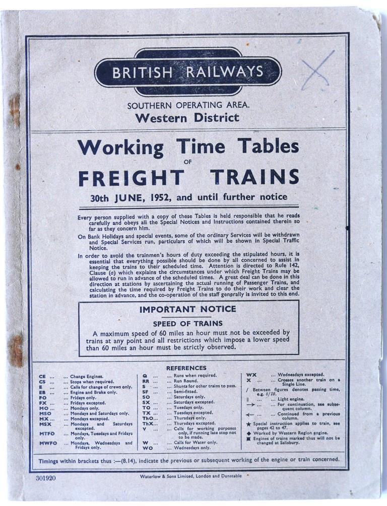 | 96 | BR(S) Western District working timetable of freight trains. 49pp dated June 1952. | £22 |  |