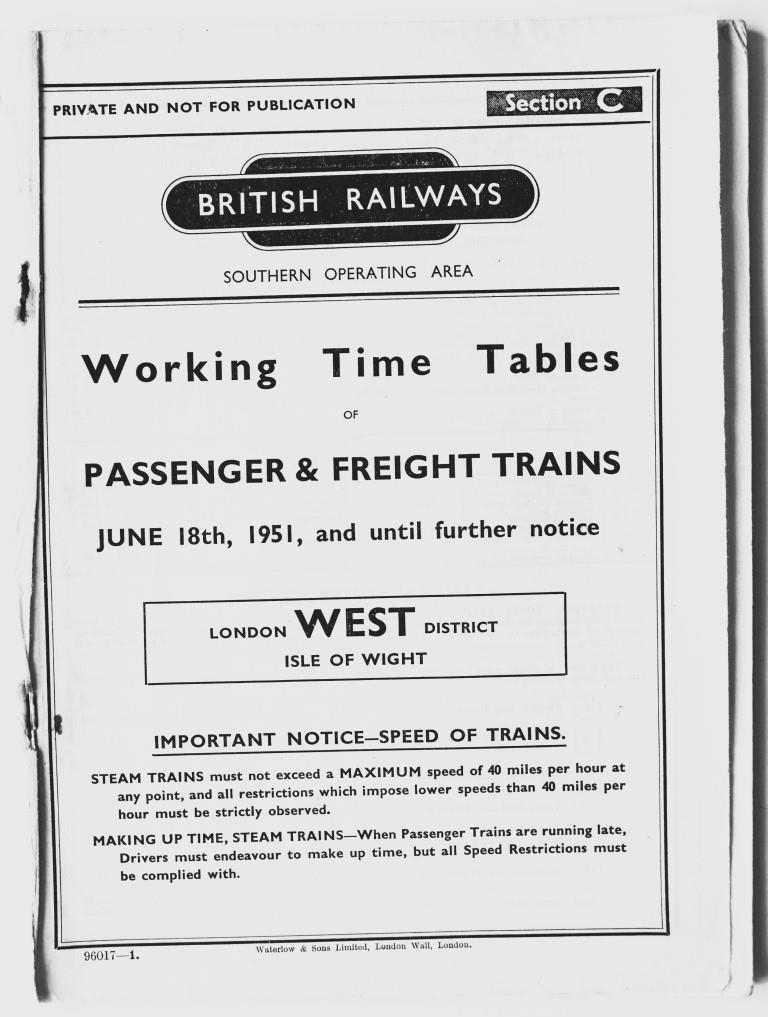| 97 | BR(S) London West District Isle of Wight section C working timetable of passenger and freight trains. 51pp dated June 1951. | £70 |  |